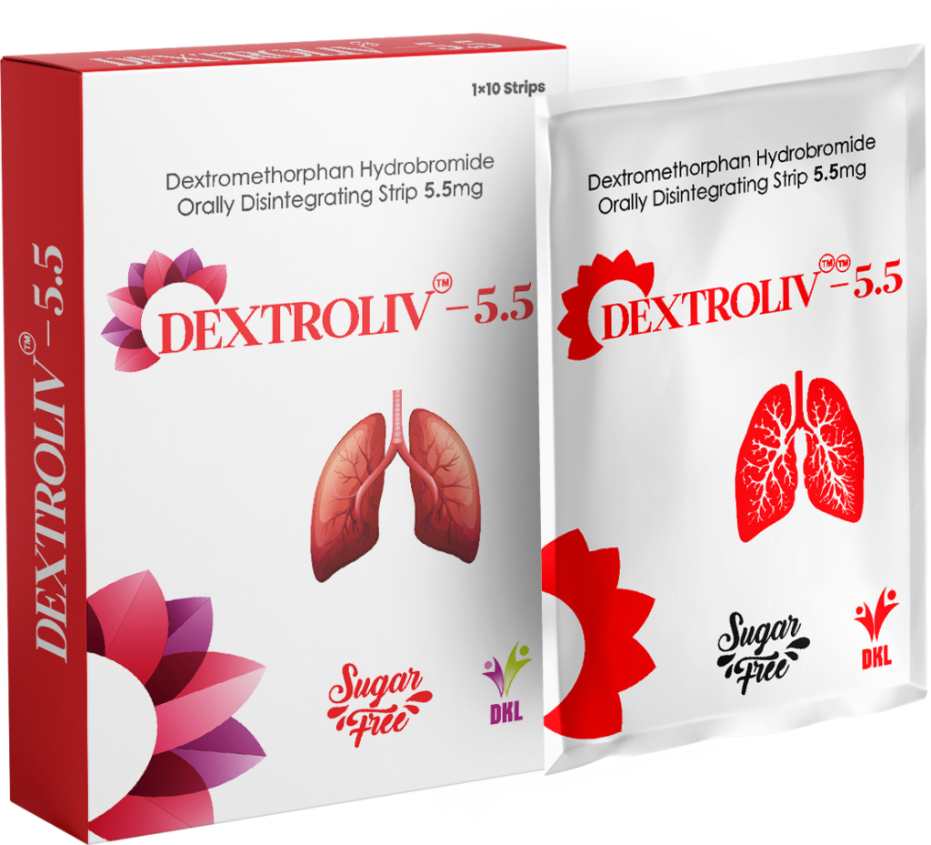 DEXTROLIV-5.5 provides effective relief from coughing and throat irritation with a convenient, fast-acting strip. Each strip contains 5.5 mg of Dextromethorphan Hydrobromide, designed to dissolve instantly in the mouth, offering quick relief without the need for water. This sugar-free formulation, with its pleasant flavor, makes it easy to use anytime, anywhere. DEXTROLIV-5.5 is portable and discreet, providing a hassle-free solution for managing cough symptoms. Experience the convenience and effectiveness of DEXTROLIV-5.5 Orally Disintegrating Strips for quick, on-the-go cough relief!
